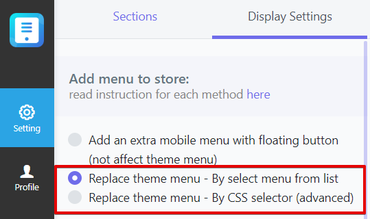 In case you want to keep your original mobile menu, use this option to add Mobile Menu app as a separate menu.