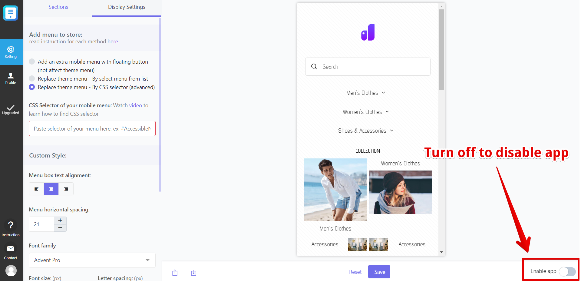 After creating your menu in Mobile Menu app (not Smart Menu), you can go to Display settings tab to:
