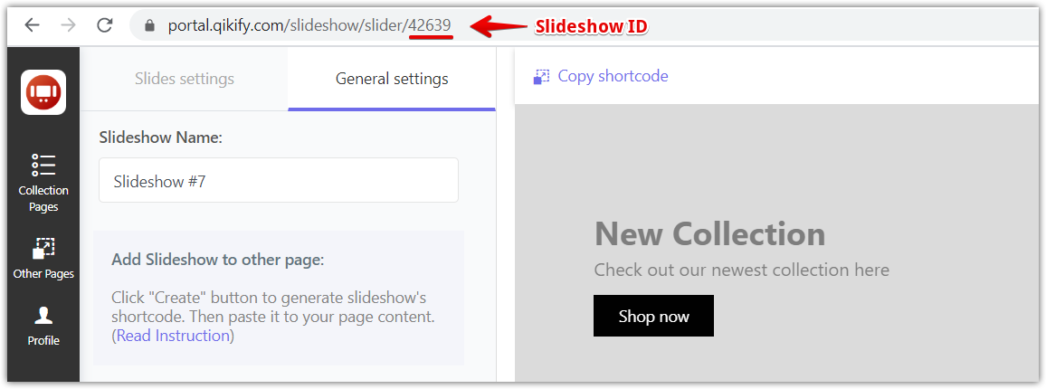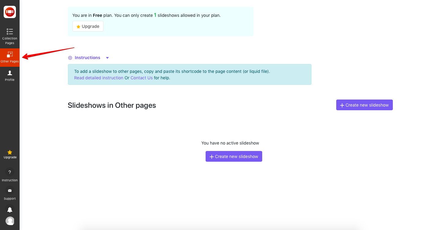 To add slideshows to other pages outside collection pages, you need to create slideshows in the "Other pages" section.