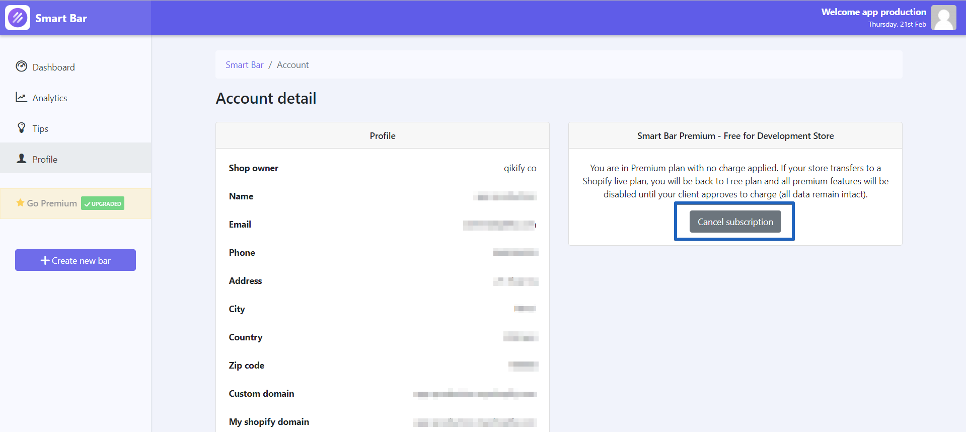 After canceling, a message will appear to show you when your Premium plan will end (based on the date when app charge was generated).