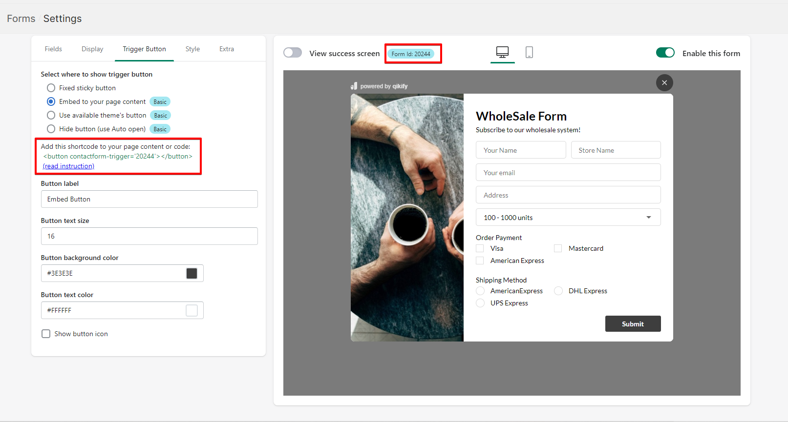 In Display > Open form in > select Embed Form if you want to display Contact Form in the page content, don't want to trigger form with a button. If you use the form as Embed Form, you do NOT need to configure the Trigger Button settings The Embed ...