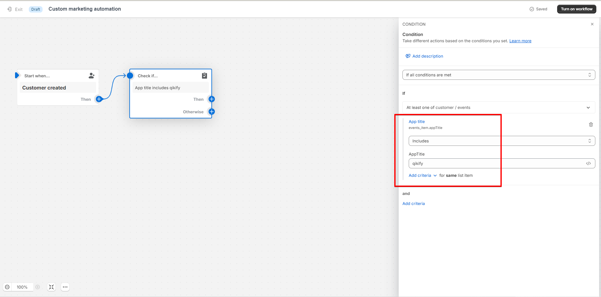 Choose condition > Customer > events > appTitle > Includes > enter AppTitle “qikify”.