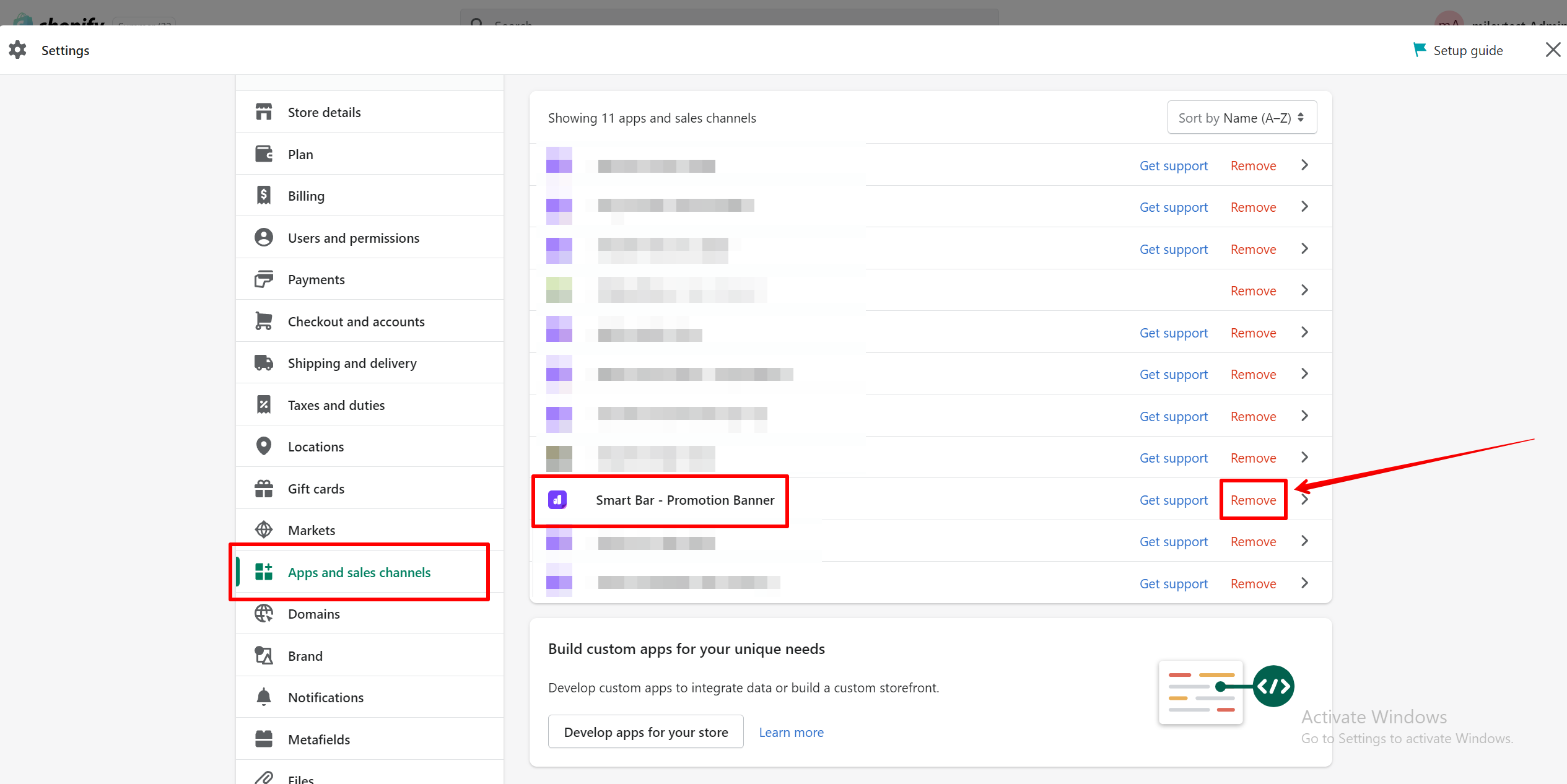 Go to your Shopify admin > Settings > Apps and sales channels > find Smart Bar - Promotion Banner app > click on Remove button.