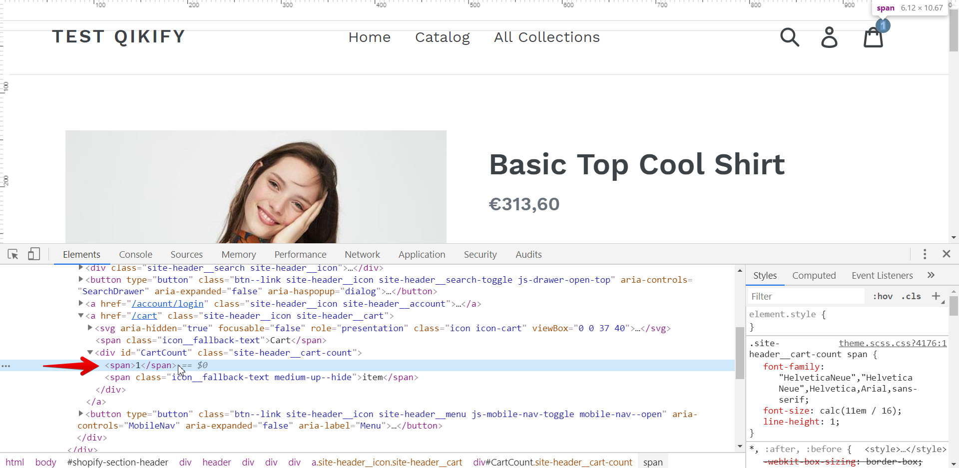 Right click on THE NUMBER of the cart count → Inspect.