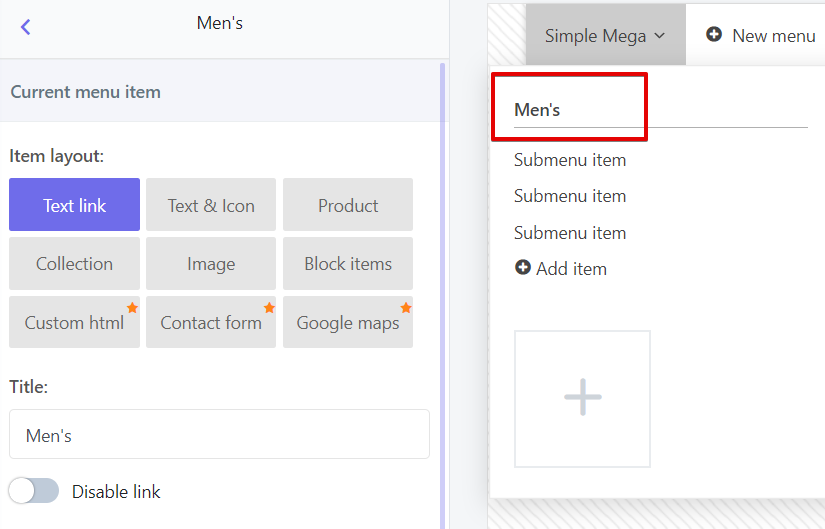 - Disable link: enable this option if you don't want to attach any link to this menu item.