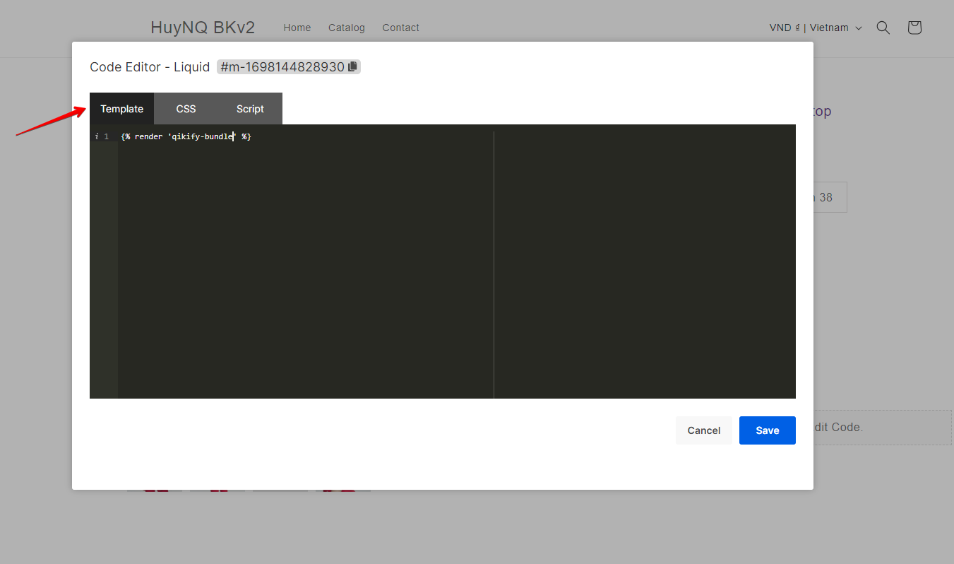 4. Add this line of code to Template editor: {% render 'qikify-bundle' %}